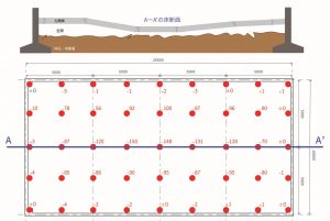 測量した値から現在の床の沈下状況を数値で把握して算出します。